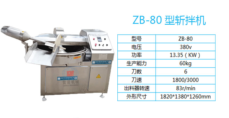 斬拌機(jī)在利用斬刀高速旋轉(zhuǎn)的斬切作用,將肉及輔料在短時間內(nèi)斬成肉餡或肉泥狀,還可以將肉、輔料、水一起攪拌成均勻的乳化物??蛇x刀型為月牙刀(加工肉糜類產(chǎn)品)和折線刀(加工肉粒產(chǎn)品) , 刀厚5mm,排列寬度110mm。
