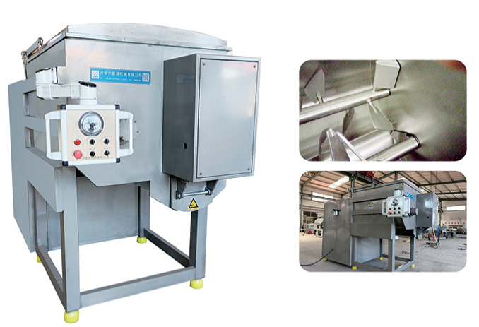 真空拌餡機(jī)是用于混料的設(shè)備,效率高,便于操作,是制作風(fēng)干腸類產(chǎn)品、粒狀、泥狀混合腸類產(chǎn)品、丸類產(chǎn)品的優(yōu)選設(shè)備,同時(shí)也是生產(chǎn)水餃.餛飩類面食產(chǎn)品的可選設(shè)備。