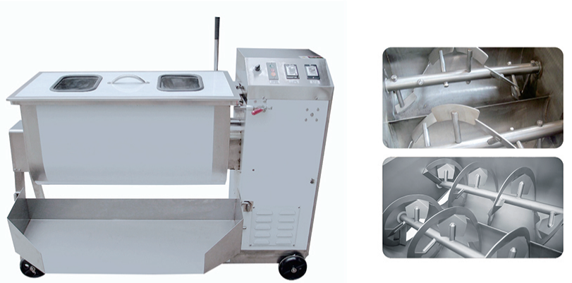 我公司生產(chǎn)的拌餡機(jī)是參照國際同類先 進(jìn)產(chǎn)品的特點(diǎn),同時(shí)結(jié)合我國肉制品加工工藝特點(diǎn),自行研制開發(fā)的。該機(jī)可進(jìn)行餡狀、散狀、醬狀物料的攪拌混合。經(jīng)過攪拌的餡粘度增加,富有彈性,特制的扇形攪拌器,在攪拌的同時(shí)又對餡料起嫩化作用,與國內(nèi)同類產(chǎn)品相比較可顯著提高工作效率,是食品生產(chǎn)的- -道重要工序。該機(jī)設(shè)有正逆運(yùn)轉(zhuǎn),可滿足不同攪拌工藝的要求。